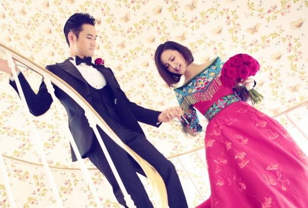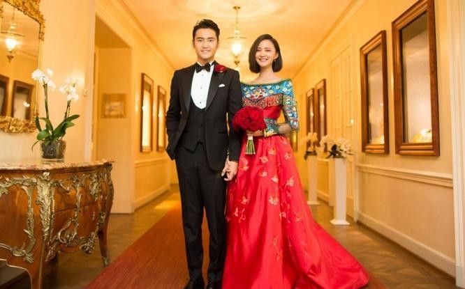 新娘张歆艺当天身着劳伦斯许为其定制的中式礼服,以明代凤冠点翠为设计灵感,一袭复古的大红色长裙加上绣制、镶嵌的珍珠宝石,纯手工缝制据悉历时三月之久,整体造型古典优雅,独具文艺气息。
