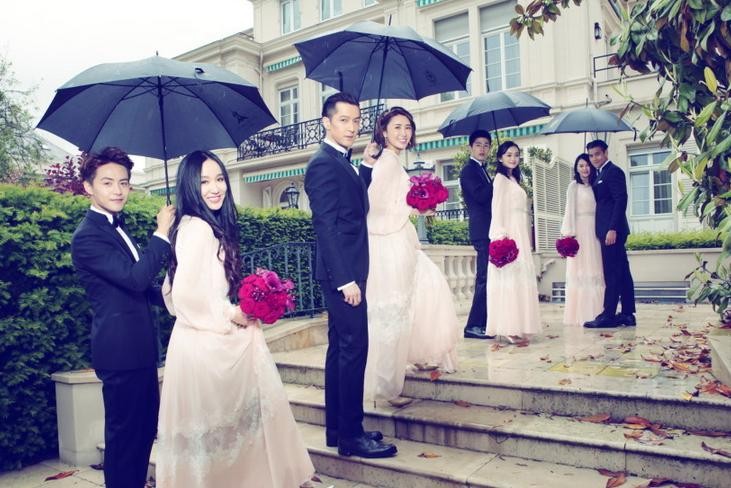 最强伴郎伴娘团的到来也为这场婚礼增添了色彩,由彭于晏、刘昊然、胡歌、马天宇组成的伴郎团统一的黑西服风度翩翩,谭维维、何泓姗、吕夏、娄艺潇组成的伴娘团着特意设计的裸粉色长裙,在草地上与新郎袁弘纷纷撑伞合照,梦幻美好,文艺之余还不忘逗比。