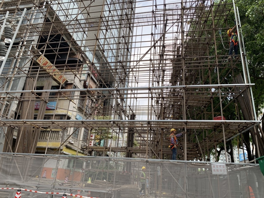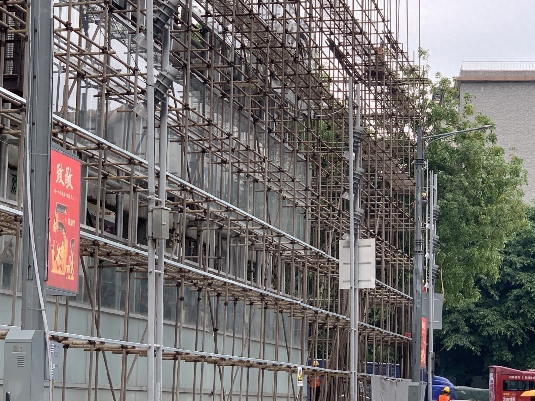 记者现场看到,“文和友”外围被脚手架围蔽,招牌和建筑外立面仍没拆除。围蔽范围覆盖汇坊区域,不少工人在施工,现场还出动了小型的施工升降机,运送建筑材料,并且拆卸物料。