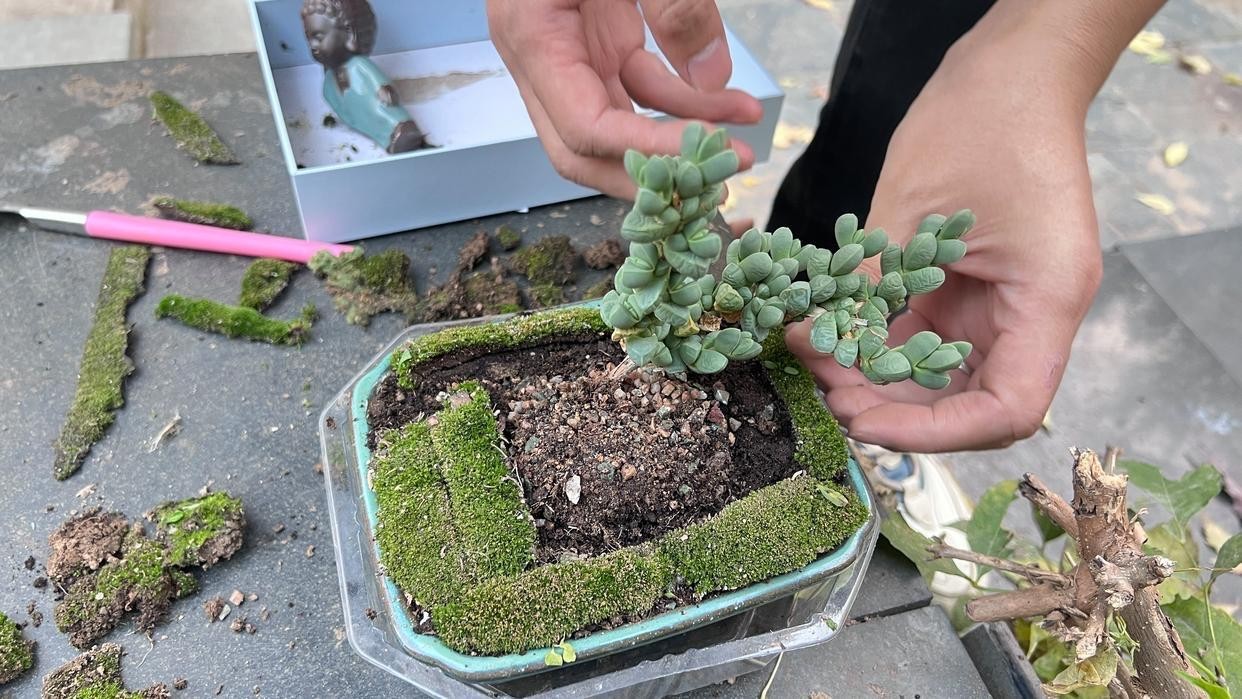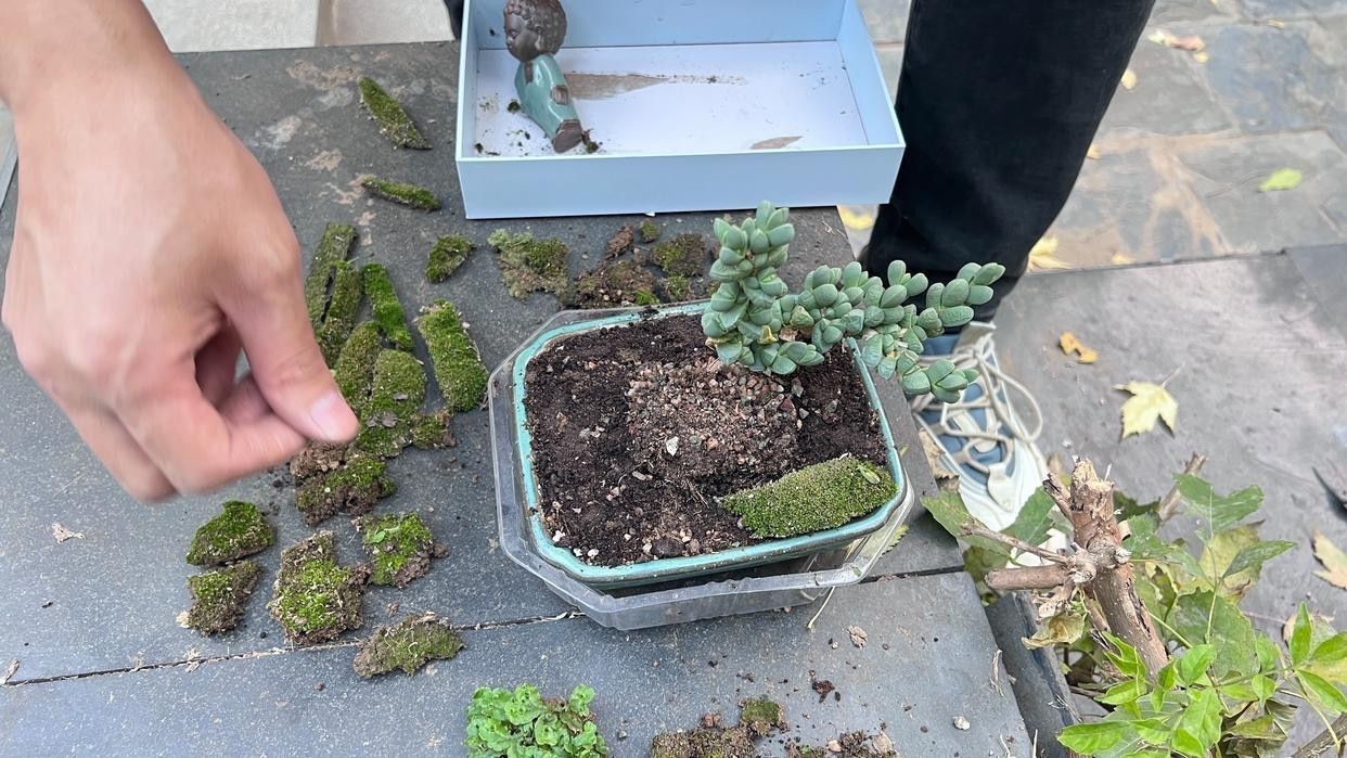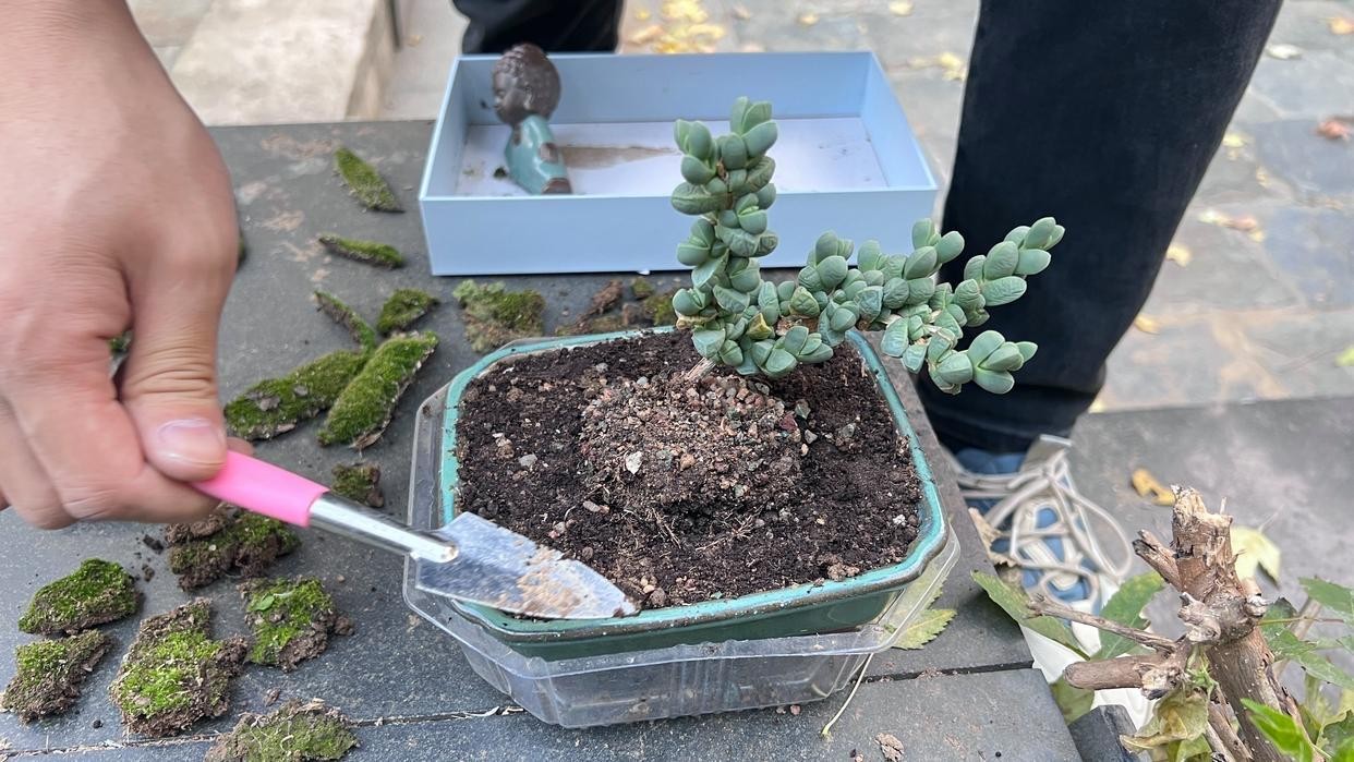 然后再准备一个大一点的花盆,盆面最好宽一点,装满土,土壤要保证足够疏松透气,一般来说4成左右的小苗土就行,然后把带有土球的鹿角海棠放到装好土的盆土里,可以稍微挖一个小坑,把它放进去,防止倒倒伏即可。浇水的时候,直接浇新花盆的土即可,这样鹿角海棠的根系就会慢慢深扎到新土当中,这个阶段就不要控水太厉害了,当然了修剪也不能停。