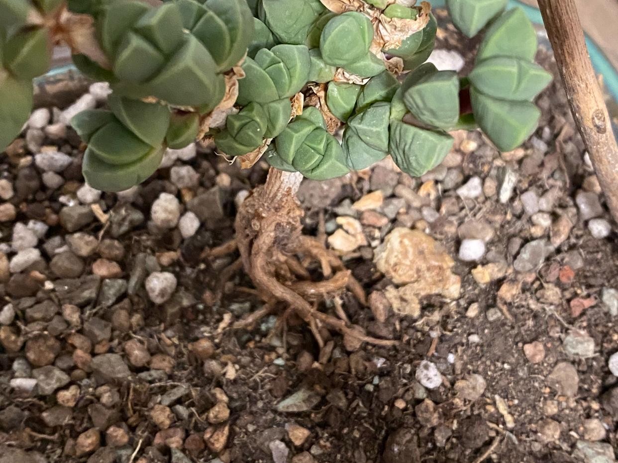 在新的环境当中生长一年左右就可以开始第一次提根了,我们可以用镊子一点点清理掉原来的土球,这样根系就能一点点露出来,达到提根的效果。这个过程当中,要细心一些,以免伤到一些还不强健的根系。我的这棵养护的时间只有半年,因此很多根系还不够强健,因此伤了不少细根,因此建议花友们不要太着急,要多养一段时间,等主根都足够强健之后再清理周围的浮土,这样会更好一些。