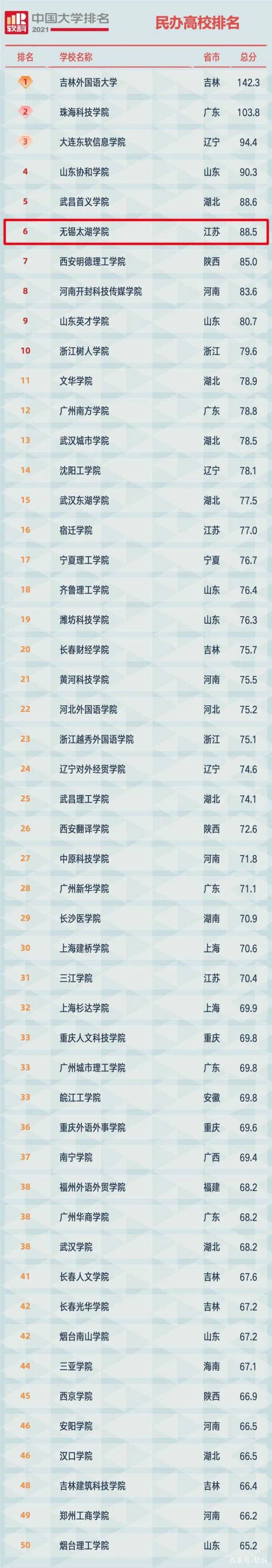 日前,全球领先的高等教育评价专业机构软科正式发布“2021软科中国大学排名”,无锡太湖学院在上榜的205所民办高校中位列全国第六名,江苏省同类高校第一名。