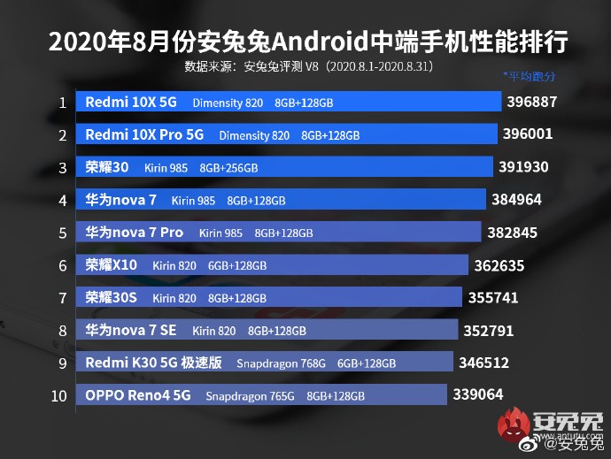 中端机方面,自从搭载天820的红米10X上市之后,就一直霸榜着中端机的前两名。但是整体比起麒麟985来,也只是微弱的跑分领先。在天玑820之后,就是成堆搭载麒麟芯片的手机,因为高通今年的中端芯片太弱,所以已经被挤到了后两名。