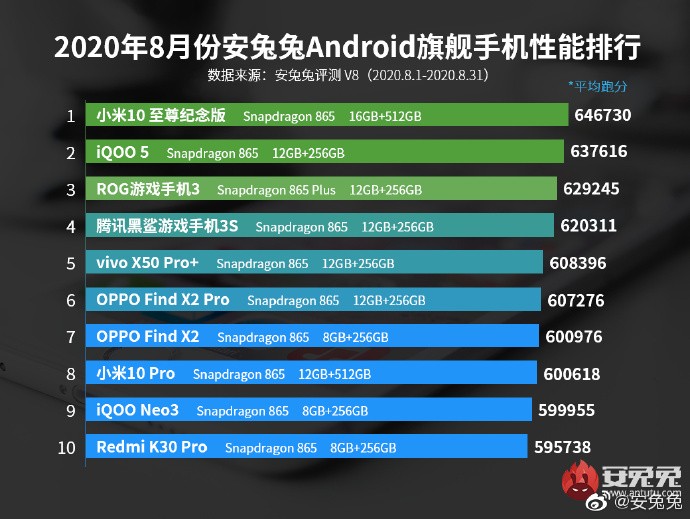 第三名为ROG游戏手机3,搭载骁龙865+跑分62.9万,算是正常的表现吧。不过联想拯救者没有上榜,感到疑惑。要说这款手机没卖够1000台肯定是不可能的,没上榜的原因,可能拯救者用户不喜欢用安兔兔跑分吧。