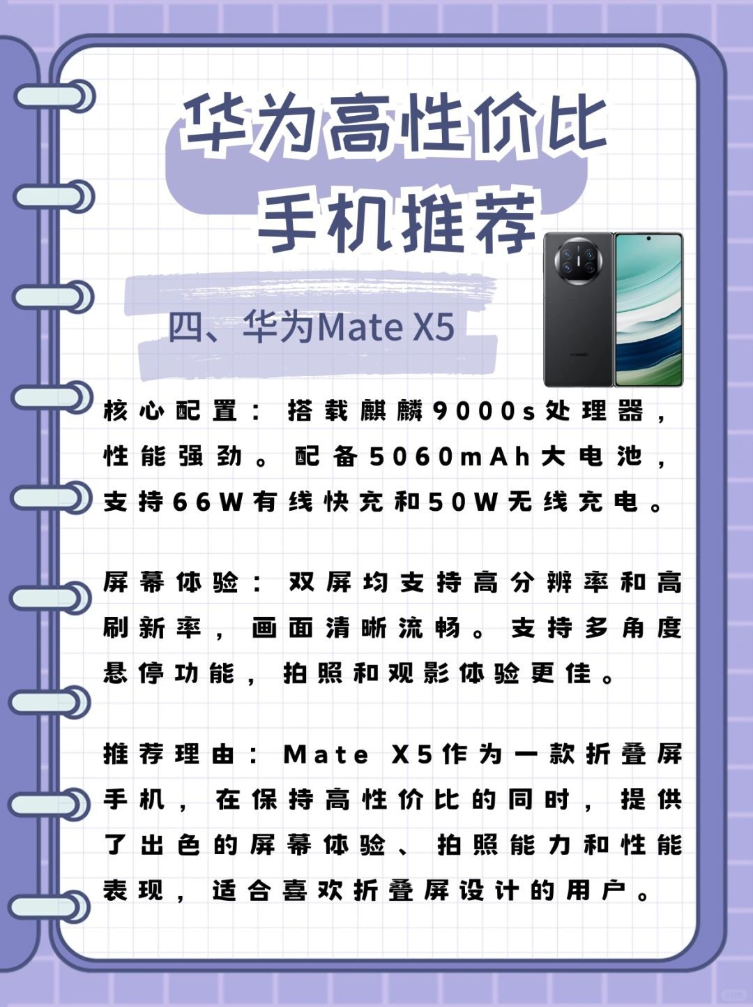 - **推荐理由**:Mate X5作为一款折叠屏手机,在保持高性价比的同时,提供了出色的屏幕体验、拍照能力和性能表现,适合喜欢折叠屏设计的用户。