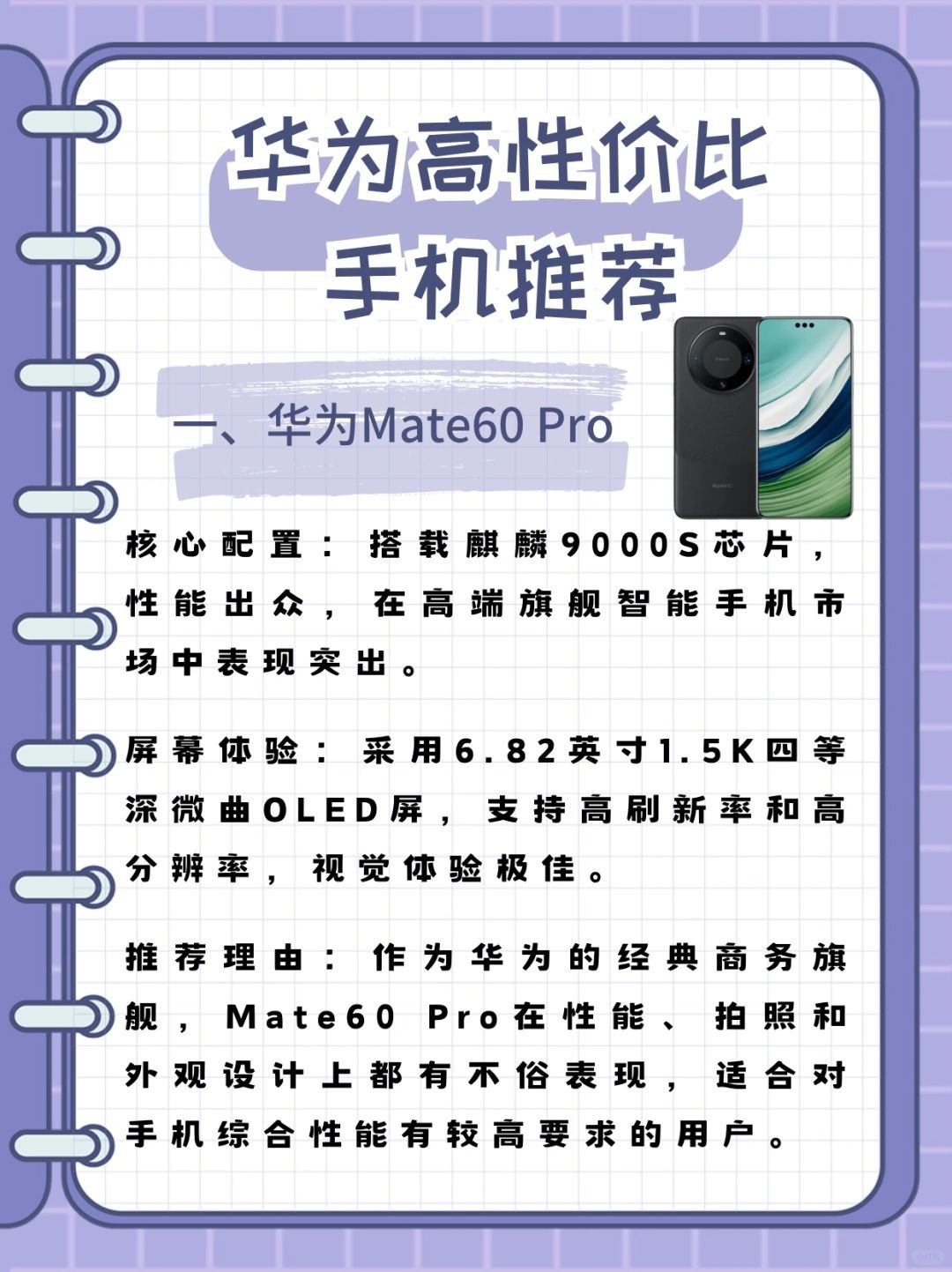 - **推荐理由**:作为华为的经典商务旗舰,Mate 60 Pro在性能、拍照和外观设计上都有不俗表现,适合对手机综合性能有较高要求的用户。