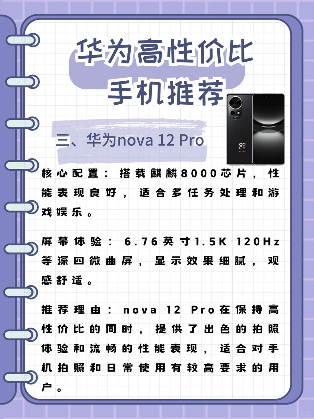 - **推荐理由**:nova 12 Pro在保持高性价比的同时,提供了出色的拍照体验和流畅的性能表现,适合对手机拍照和日常使用有较高要求的用户。