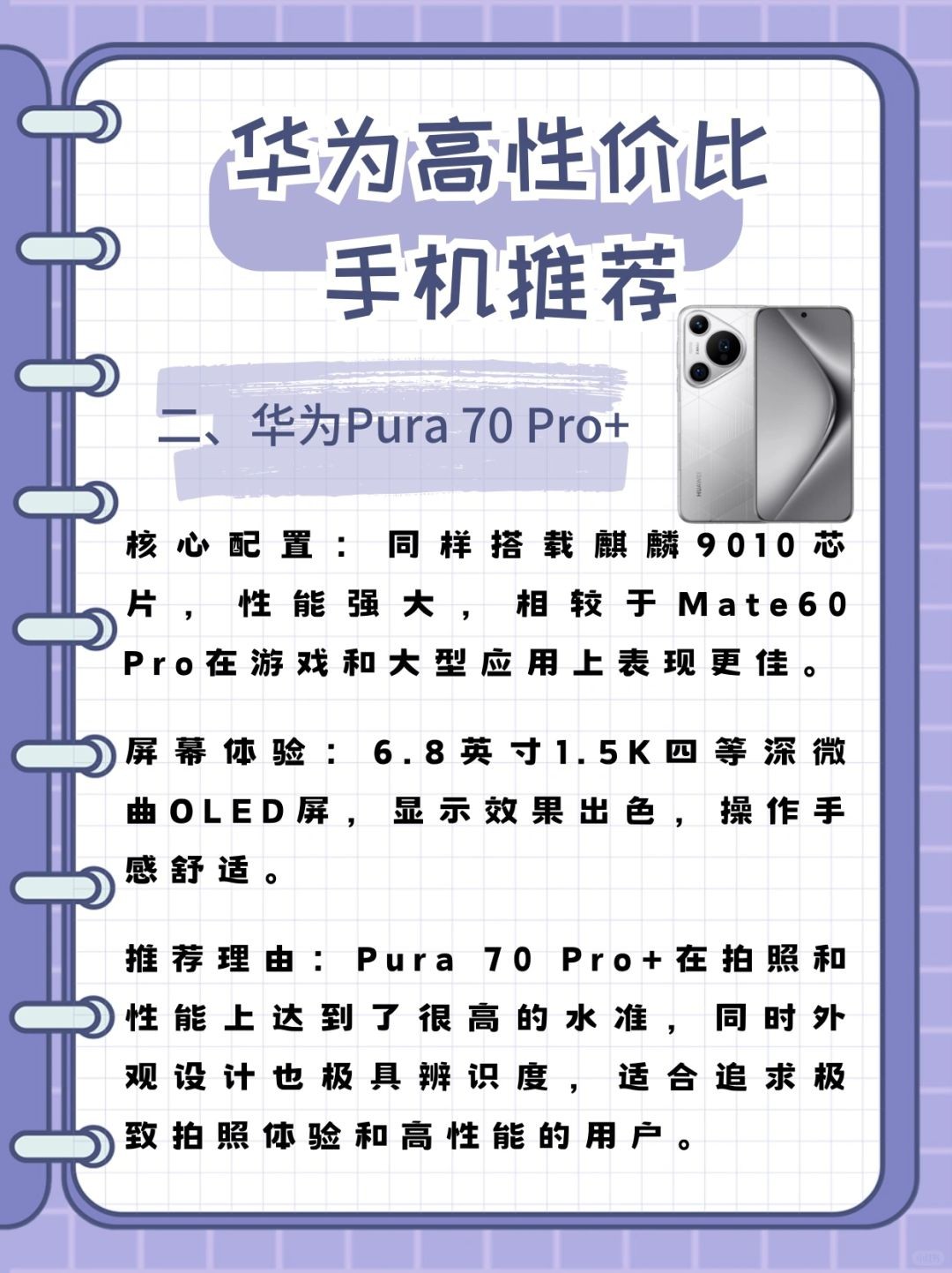 - **推荐理由**:Pura 70 Pro+在拍照和性能上达到了很高的水准,同时外观设计也极具辨识度,适合追求极致拍照体验和高性能的用户。