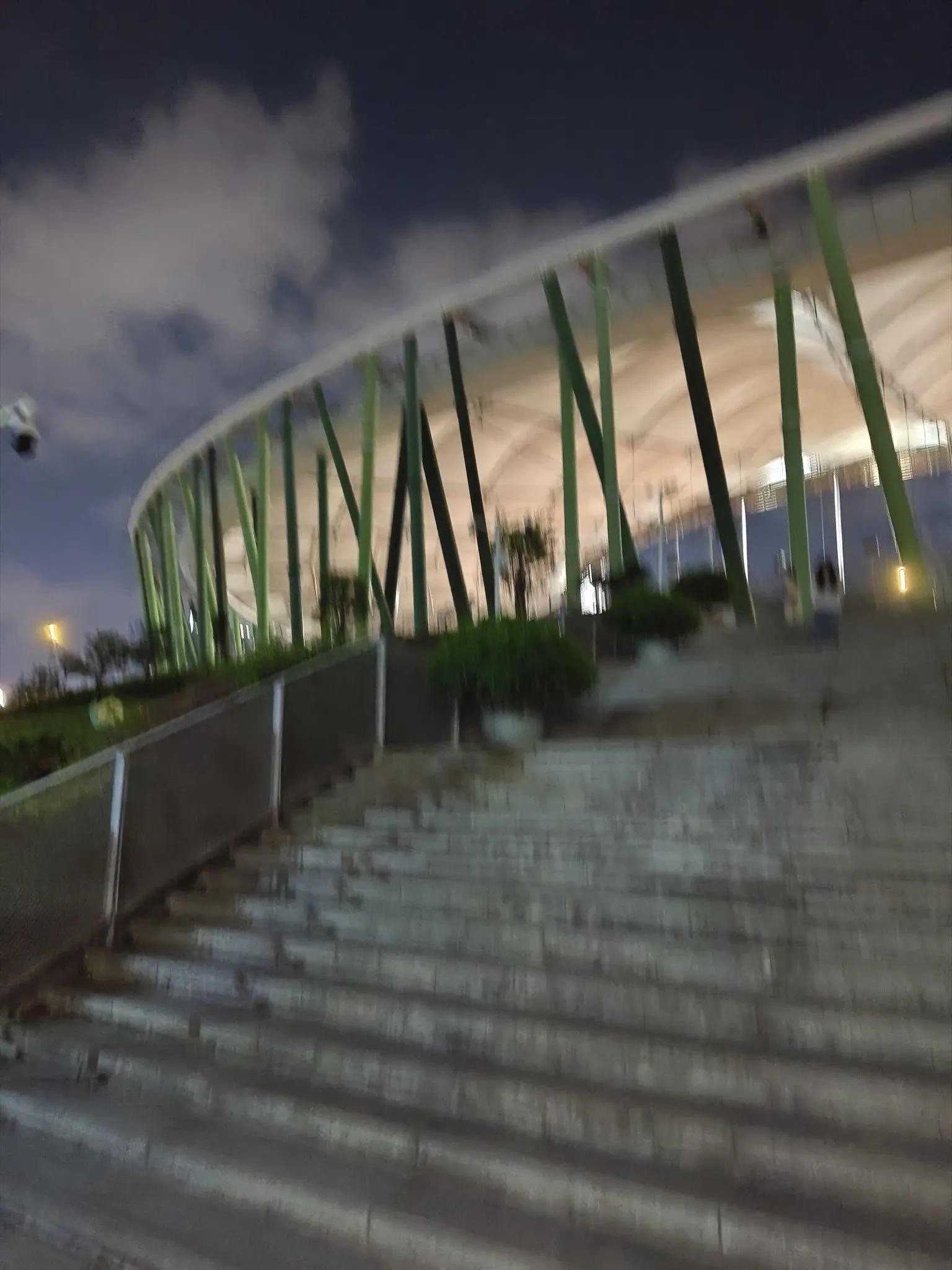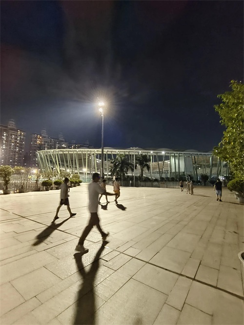 今晚散步到了宝安体育馆,这是一座集体育竞赛、大型文艺演出、会议展览、全民健身等多种功能于一体的大型现代化综合场馆,体育馆左边是蓝球馆,右边是足球场,而足球场又设有内外两个球场,每到傍晚华灯初放之时,外足球场每天是对外开放的,有跑步的、有踢球的,是群众健身的好去处。