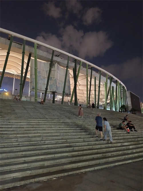 来这里散步你可以进入外足球场内的400米标准跑道走,也可以围绕宝体建筑的外建筑平台散步,平台之外还有几个小广场、多种健身器材,有跳广场舞的,也有做健身操的,还有小孩玩滑板、轮滑的,这也是宝安晚上最热闹的地方,去年修建的通往欢乐海岸的立体通道也与宝体连通,从宝体外围的建筑平台就可以上立体通道至欢乐海岸,非常便捷,沿途也是风光无限,来深圳一定到宝体看看,一号地铁线很方便哟。