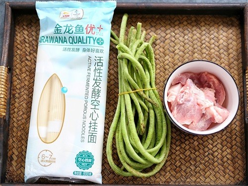 金龙鱼优+活性发酵空心挂面150克、豆角200克、去皮五花肉120克、生抽3勺、老抽1勺、蚝油1勺、料酒1勺、淀粉2勺、盐少许、姜末少许、大蒜3瓣、水4勺、花椒少许