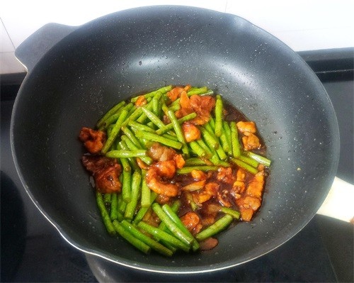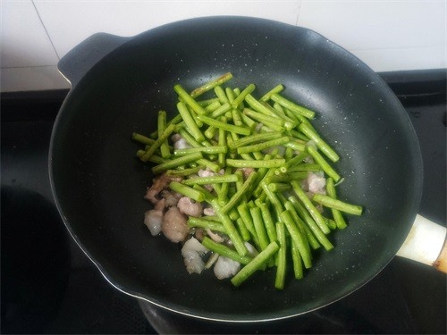 5、待猪肉炒到变色后,我们把豆角下锅,继续翻炒