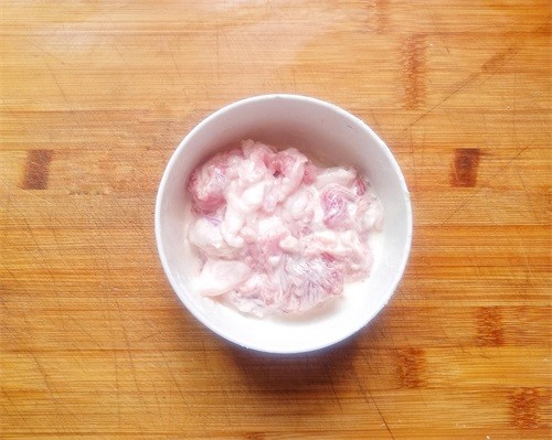 2、将五花肉洗干净,切成薄片状,放在碗内,加入1勺料酒和2勺淀粉,混合均匀后,腌制10分钟