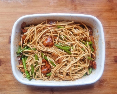 8、捞出后的挂面过下凉水,控干水分后,和刚刚炒好的菜一起倒入盆子内,用筷子翻拌均匀,让每一根面条上,都挂满汤汁