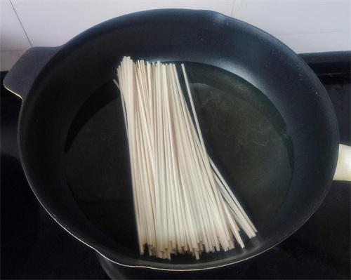 7、接下来处理面的部分,挂面热水下锅,煮到面条变软,立刻捞出。因为我没买到鲜面条,所以用挂面替代了,其实口感劲道耐煮的挂面,也是可以用来做蒸面的,味道一样好吃