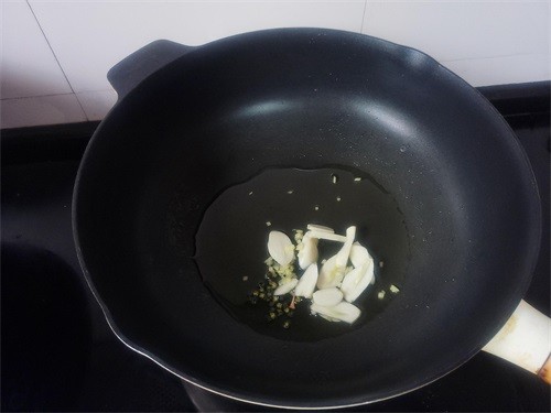 3、锅内倒入适量的油,油要比平时炒菜的油多一些,然后把花椒、姜末、大蒜片下锅,用中小火炒出香味