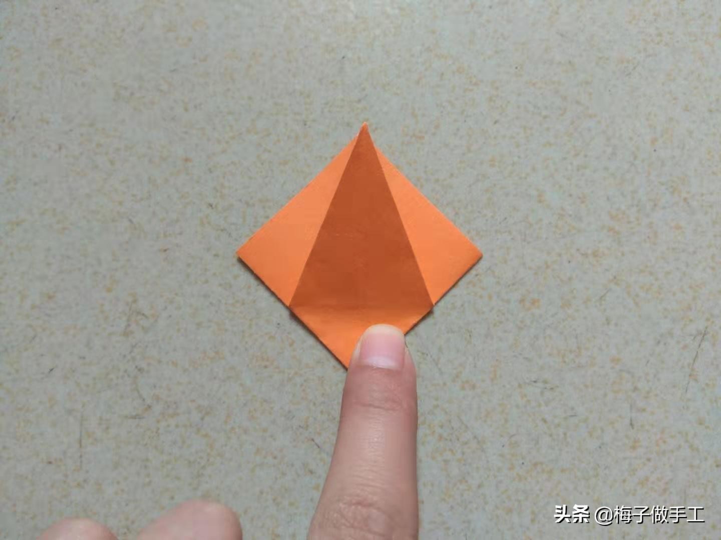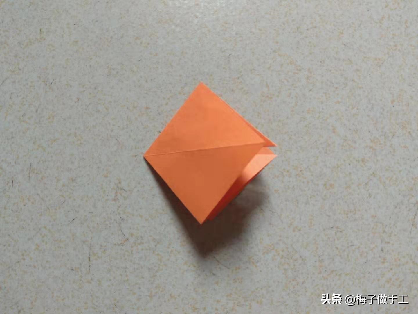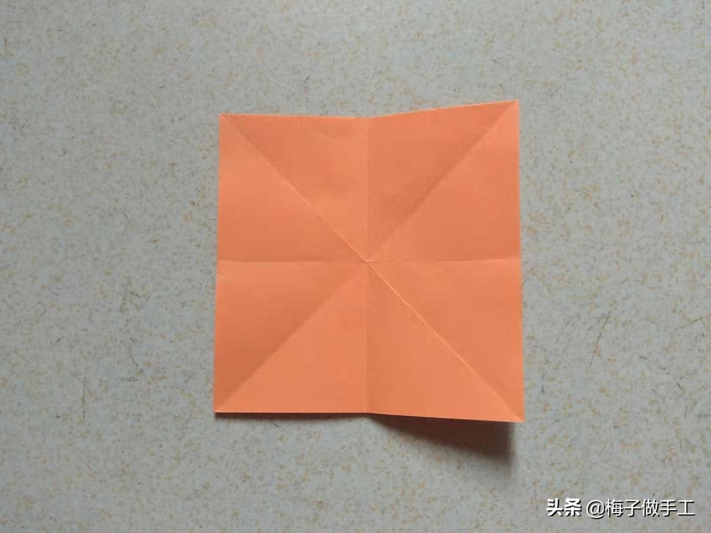 2、沿一条对角线向内折,得到一个双层小正方形。