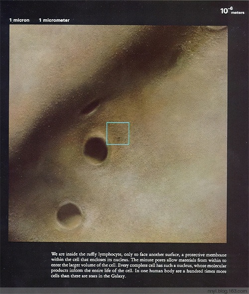 现在我们进入了这个皱皱的淋巴细胞。结果看到的却是另一个表层,一层保护细胞核的膜。这些细小的孔使得物质可以从里面运输出去。每一个完整的细胞都有一个细胞核,它所产生的近核物质指挥了细胞的一生。在每一个人的体内的细胞数目是星系是中星球数目的几百倍。