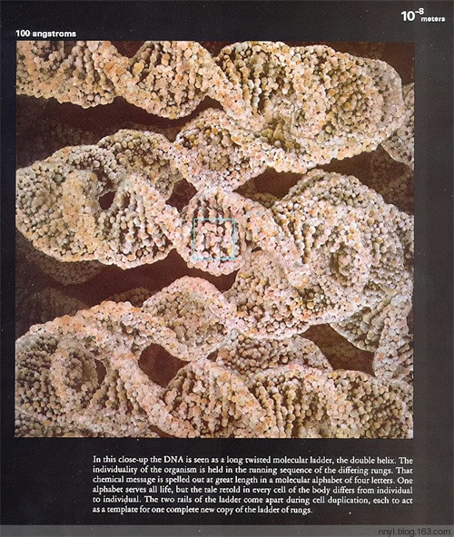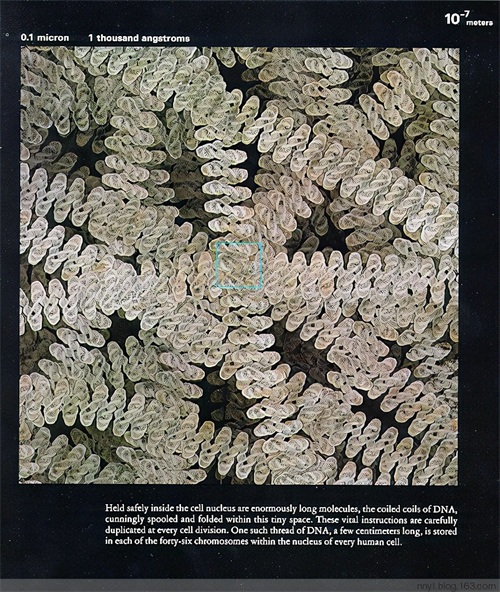 待在细胞核内的是长长的分子链——螺旋DNA(脱氧核糖核酸啵)。它们精致而巧妙地盘在狭小的空间里。每当细胞分裂时,极为重要的指令都会被小心地复制。一条这样的DNA链大约有几厘米长。而每个人类细胞的核里的四十六条染色体中都有这么一条DNA链。