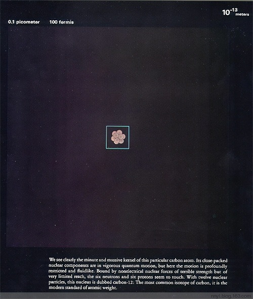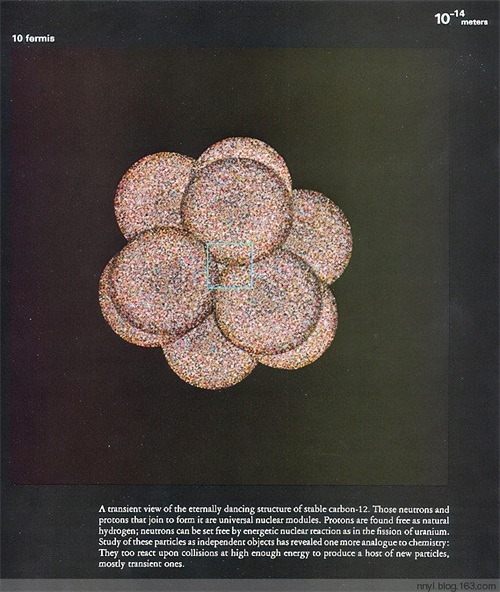 神秘的原子核隆重登场。不要忘了,我们现在观察的是碳原子的核,这里显示碳原子核中6个中子和6个质子几乎贴在了一起。带有这12个核子的核被称为碳12,它是碳元素最常见的同位素,也是现代原子量的度量标准。