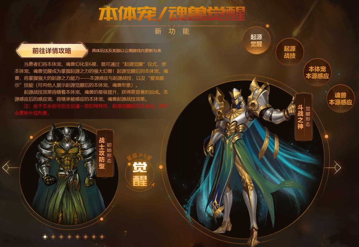 在这个系统中,玩家们把本体宠和魂兽幻化至6星,就可通过“起源觉醒”仪式,使本体宠、魂兽觉醒成为掌握起源之力的强大幻兽!而起源觉醒后的本体宠、魂兽,还能拥有强大的起源之力能力—本源感应与起源战技,以及“爱宠展示”技能(可向他人展示起源觉醒后的本体宠、魂兽形象),并且起源战技效果将随着本体宠、魂兽的星级提升,获得更显著的加成。本源感应后的感应宠,将继承被感应的本体宠、魂兽起源战技效果。