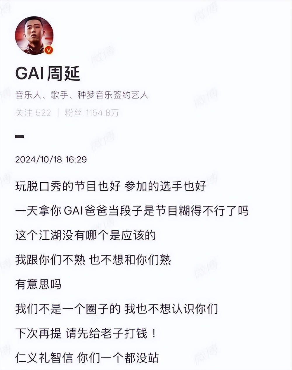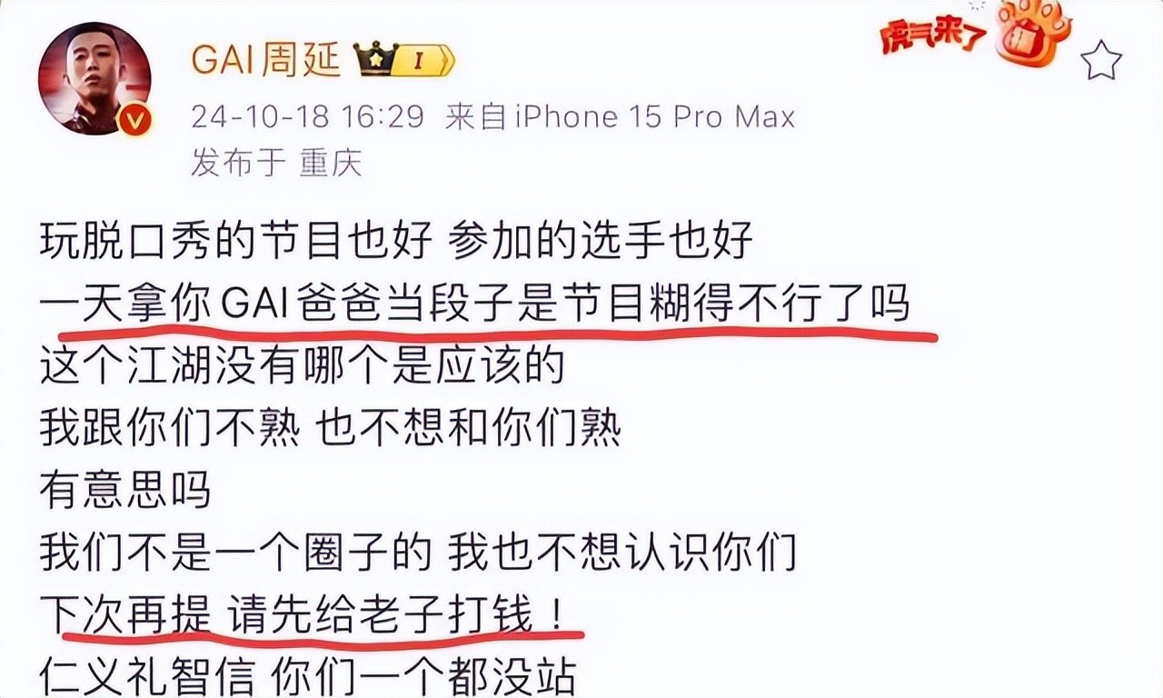 这于祥宇在节目里这么一调侃,GAI可就不干了,立马发文怒批于祥宇和那个脱口秀节目。