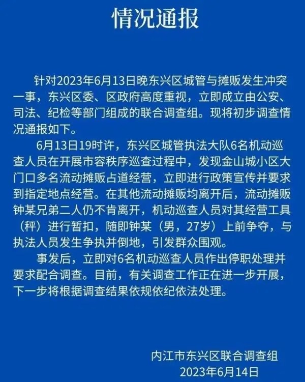 2023年6月13日晚,四川内江东兴区6名城管巡查人员,与流动商贩钟某两兄弟发生争执。