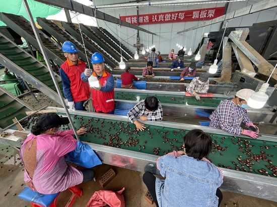 2021年9月8日,在唐山市迁西县三屯营镇彭庄农丰板栗合作社和永信板栗合作社内,迁西公司员工三屯营供电所员工田亮、张海峰正在仔细检查设备,为板栗收购“黄金期”提供安全的用电保证。 孙楠摄