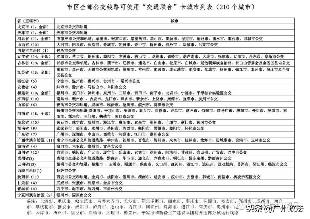 全国交通一卡通互联互通城市名单发布。210个城市市区全部公交线路实现互联互通,13个城市轨道线路实现互联互通,35个城市开通了试运行公交线路,总计覆盖全国2.2万条公交线路、52条轨道线路。