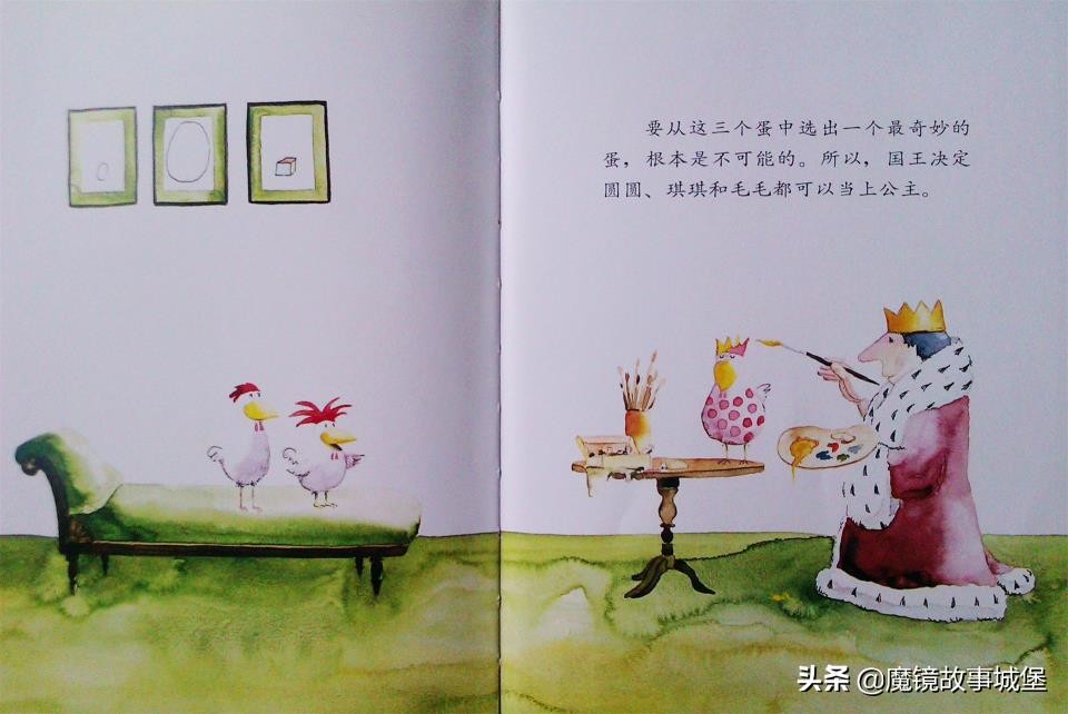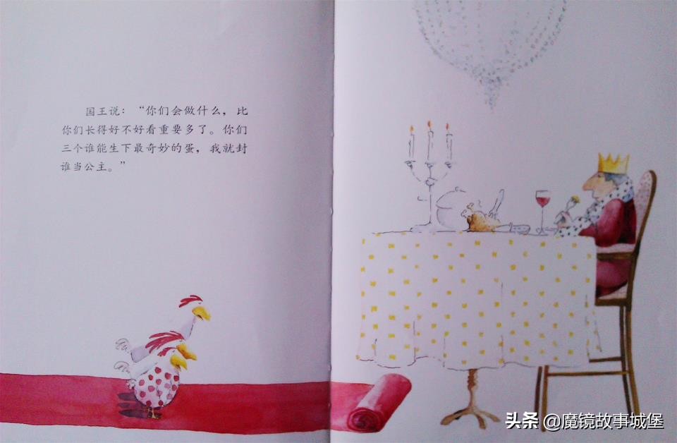 国王说:“你们会做什么,比你们谁长得好看重要多了,这样吧,你们三个谁能生下最奇妙的蛋,我就封谁当公主。”