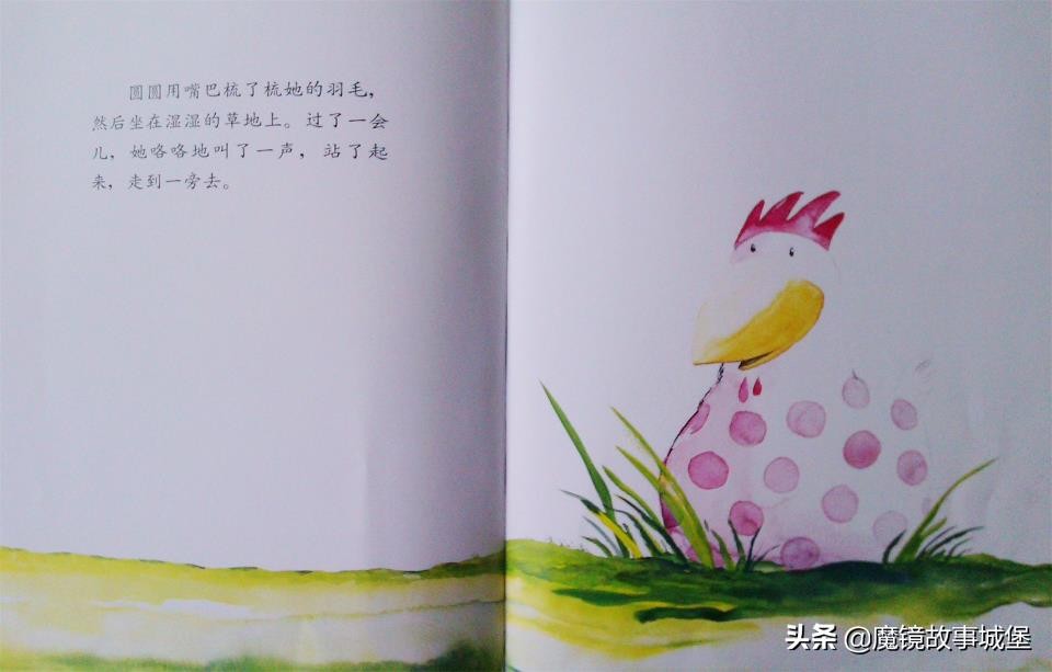 圆圆用嘴巴梳了梳她的羽毛,然后坐在了湿湿的草地上。过了一会儿,她咯咯地叫了一声,站了起来,走到了一旁。