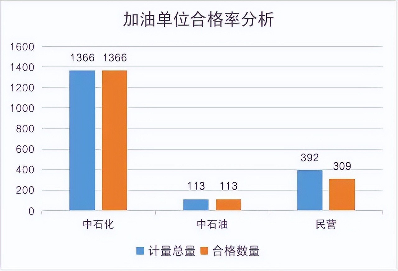 图中可以看出,两桶油合格率是100%,也就是加多少升就是多少升,但私人加油站就不一定了……在这点上,两桶油确实是比私人加油站强的。