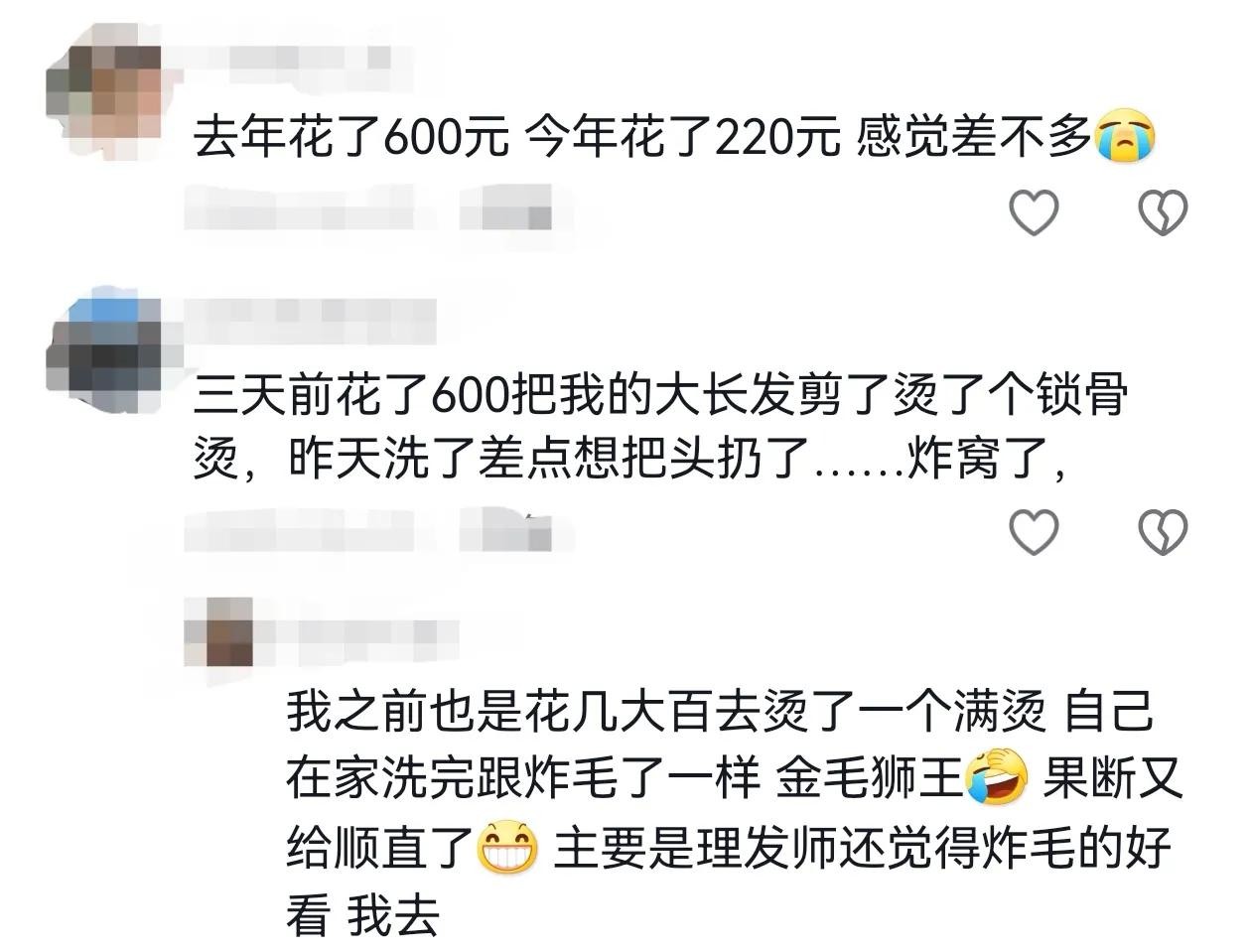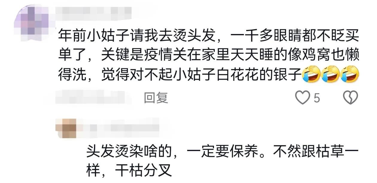 @黄黄的火龙果:年前小姑子请我去烫头发,一千多眼睛都不眨买单了,关键是疫情关在家里天天睡的像鸡窝也懒得洗,觉得对不起小姑子白花花的银子