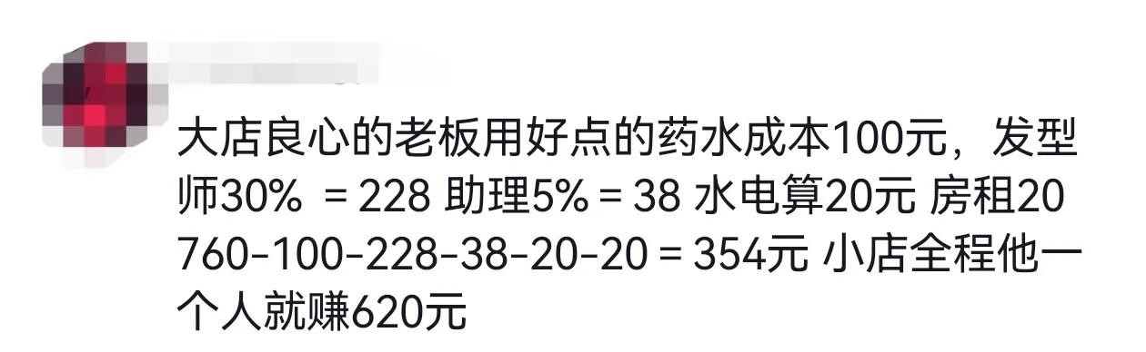 @105568337:大店良心的老板用好点的药水成本100元,发型师30% =228 助理5%=38 水电算20元 房租20 760-100-228-38-20-20=354元 小店全程他一个人就赚620元
