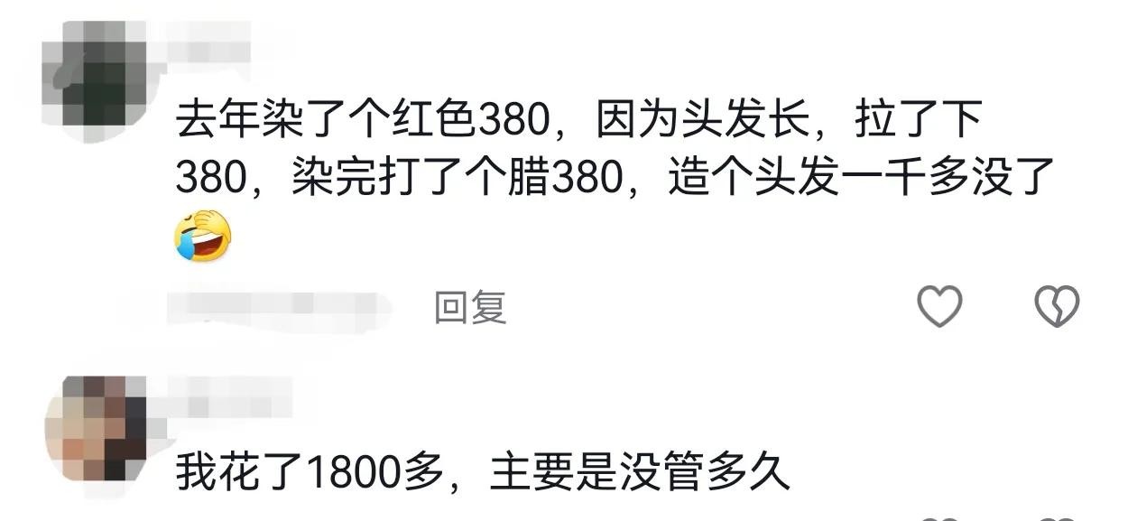 @雨落:去年染了个红色380,因为头发长,拉了下380,染完打了个腊380,造个头发一千多没了