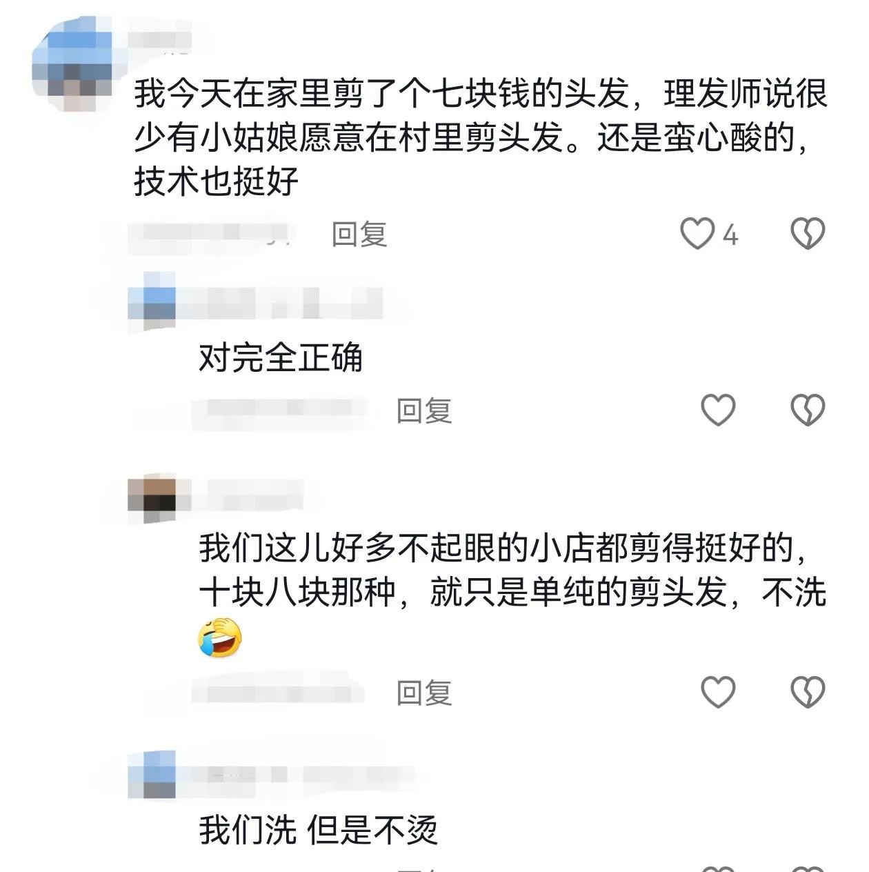 @韩妮:我今天在家里剪了个七块钱的头发,理发师说很少有小姑娘愿意在村里剪头发。还是蛮心酸的,技术也挺好