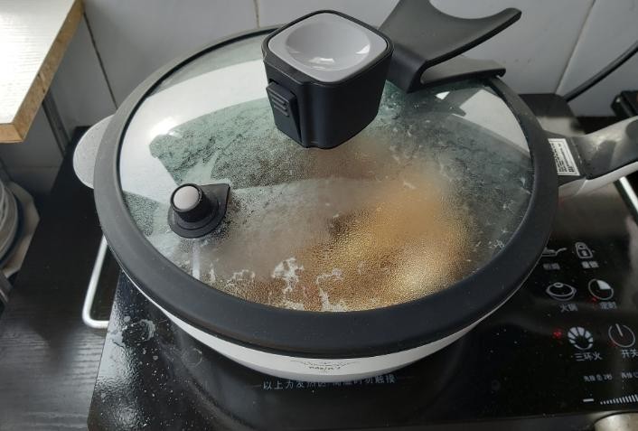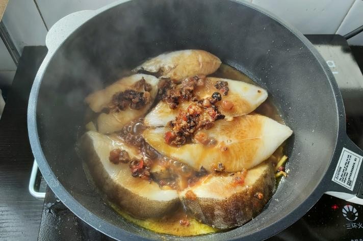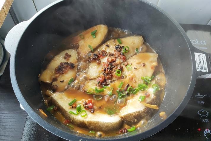 7、时间差不多了,听到锅中有响动,将锅盖打开撒入葱花转大火继续烧2~3分钟,直到将汤汁收干了浓郁,这样比目鱼就非常入味了。