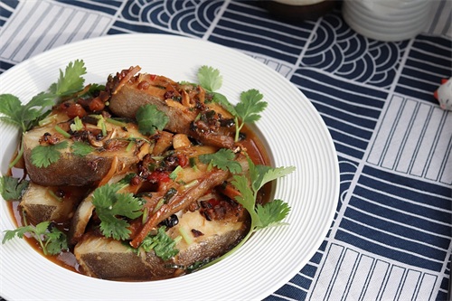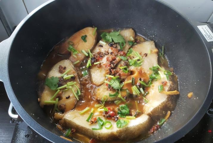 8、关火之后撒上香菜沫,这道美味的酱烧比目鱼已经做好了。