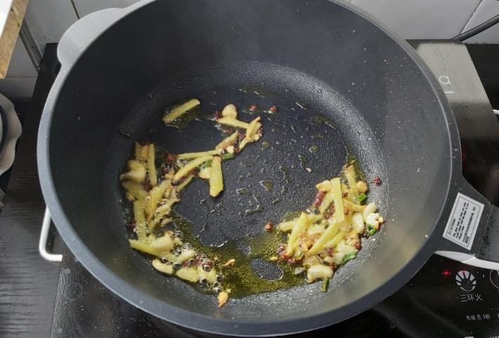 2、锅中添加一勺食用油烧热,油热之后放入花椒,姜丝,蒜末快速翻炒出香味。