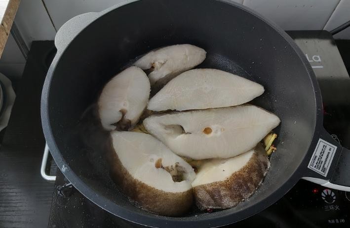 3、再将解冻后的比目鱼放入锅中转中小火。