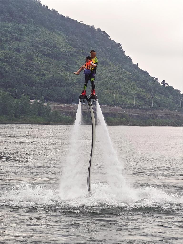 做好相应安全保护措施后,游客有序进入游玩水域,霎时间,沅江沸腾起来,欢笑声、尖叫声此起彼伏。有人乘着水上摩托乘风破浪,有人在喷射式悬浮飞行器上自由翱翔,也有人悠然划着皮划艇,享受安逸的夏日时光。