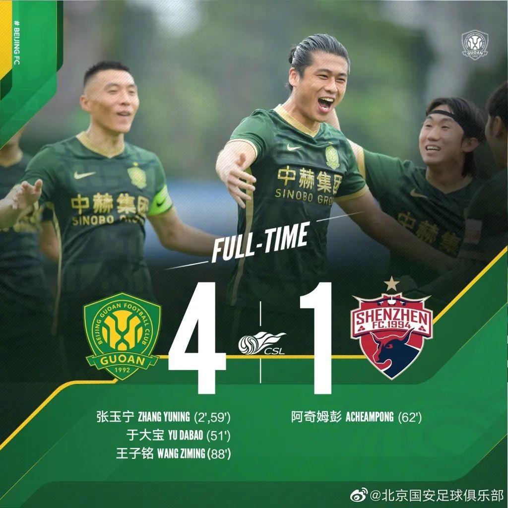 21日,北京国安在2022赛季中超联赛第5轮的较量中,以4-1战胜深圳队。
