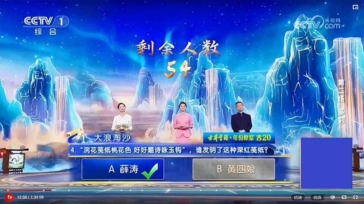 “大浪淘沙”的第四题,考的是“薛涛笺”,虽然难度比较大,但选项B是“黄四娘”这个有幸出现在杜甫诗中的普通女子,显然就是提示选手可用排除法,然而还真有选“黄四娘”的。