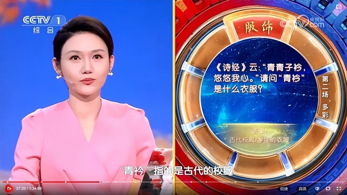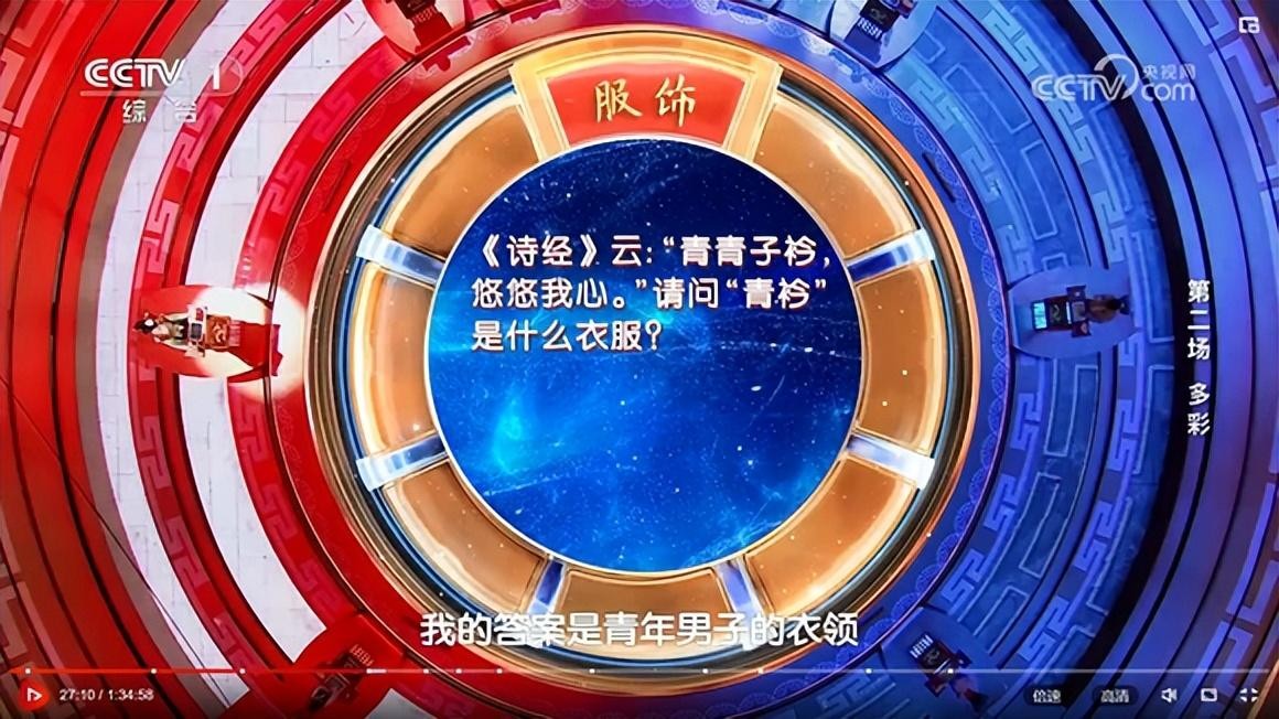 “青衿”是什么衣服?答案引起了争议。导师杨雨说“青衿”就是古代的校服,这当然是标准答案,但八年级下册语文教材上写的就是衣领,此题还引起了网友的热议。