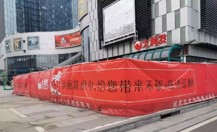 在现场,记者看到在超市入口处的空地上,部分区域正在隔离施工,施工围挡上印有“大润发,美丽装扮中,给您带来不便,敬请谅解”的字样。