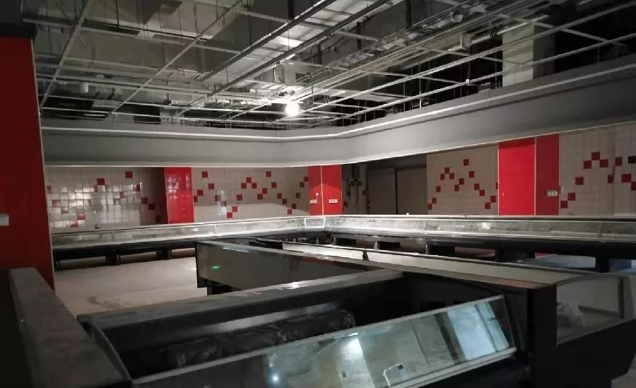 目前,大润发全福店电梯已经安装到位,部分冷鲜冷藏货架已“就位”,不同颜色的瓷砖已“上墙”,场内有不少施工人员正在施工。