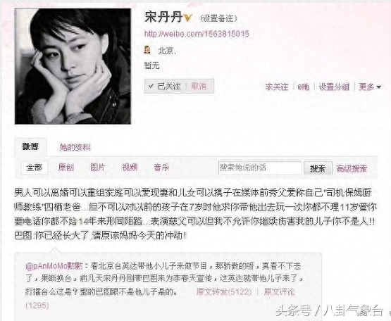 宋丹丹转发并回复了此条微博,措辞和语气非常强烈:“男人可以离婚,可以重组家庭,可以爱现妻和儿女,可以携子在媒体前秀父爱,称自己‘司机保姆厨师教练’四栖老爸……但不可以对以前的孩子,在7岁时他求你带他出去玩一次你都不理,11岁管你要电话你都不给,14年来形同陌路……表演慈父可以,但我不允许你继续伤害我的儿子,你不是人!”