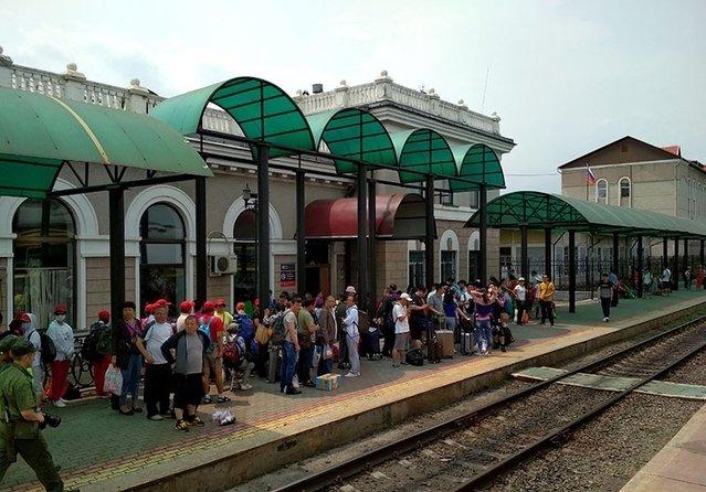 ”五一”早七点,我们在火车站与同行的来自湖北的两家游客汇合了。因为正逢“五一”小黄金周,车站内前往海参崴旅游的人很多,据当地人说俄罗斯海参崴旅游线路始终很火爆,平时游客也不少。绥芬河赴俄罗斯海参崴有汽车和火车两种交通出境方式,我们此次是坐火车出境。大家持护照、电子签证、火车票三证排队过安检,(因为是跨国旅游,旅行社给我们去俄罗斯海参崴是电子签证,去朝鲜是另纸签证)