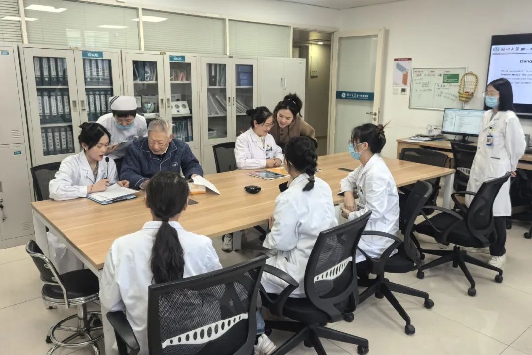 在医生办公室,2023级硕士研究生韩艺琳用英文进行了病历汇报。张效房教授神情专注,仔细倾听,并进行了专业点评。他对年轻医生在专业英语及临床病历书写上的努力表示认可,同时分享了自己在资料匮乏、条件艰苦的年代是如何学习英语的经历。他表示,在当今全球化的医疗环境下,年轻医生既要有扎实的英语功底,及时了解国际眼科前沿研究成果,还要多读文献,读中国的文献,读世界的文献,不断提升自己的专业素养和综合能力,将国际先进的治疗理念和技术引入国内,造福更多患者。