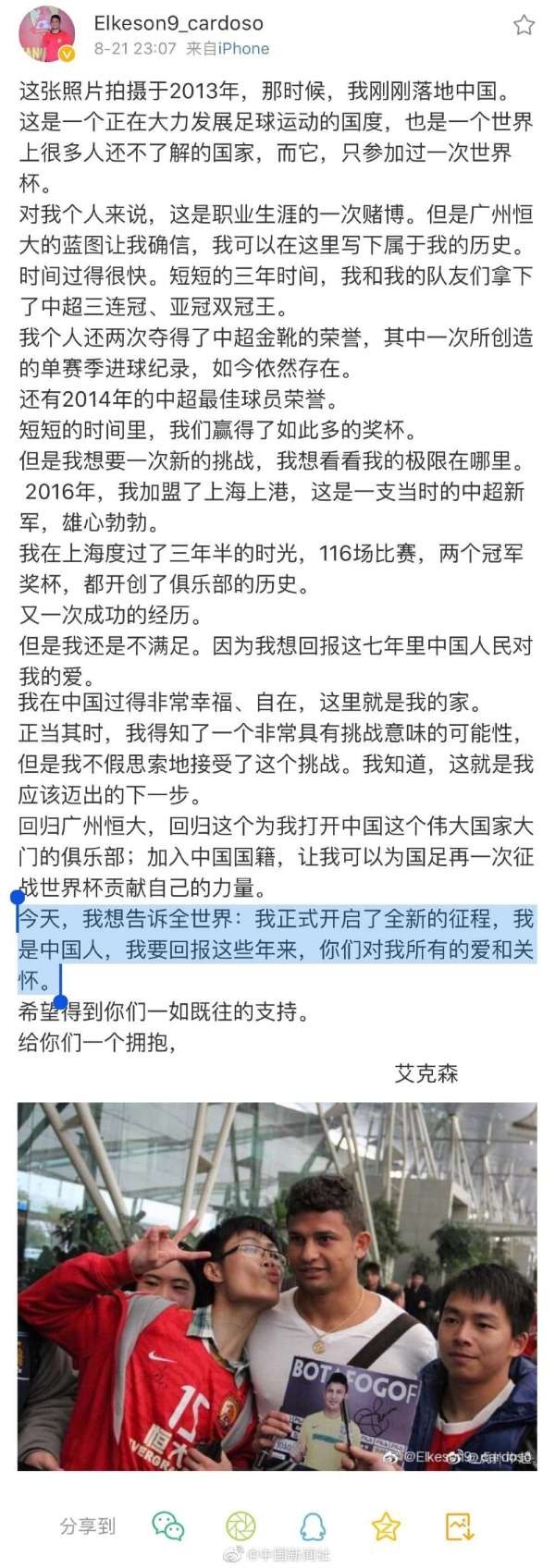 中国足协21日公布了新一期国足35人大名单,首位无中国血统归化球员艾克森在列。当晚,已在中国联赛效力7年之久的广州恒大前锋艾克森通过微博发表入籍感言:“今天,我想告诉全世界:我正式开启了全新的征程,我是中国人,我要回报这些年来,你们对我所有的爱和关怀。”